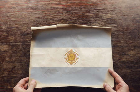 The white and blue national flag of Argentina on a torn piece of paper. A man's hands press an unfolded sheet of parchment to a brown wooden table. View from above