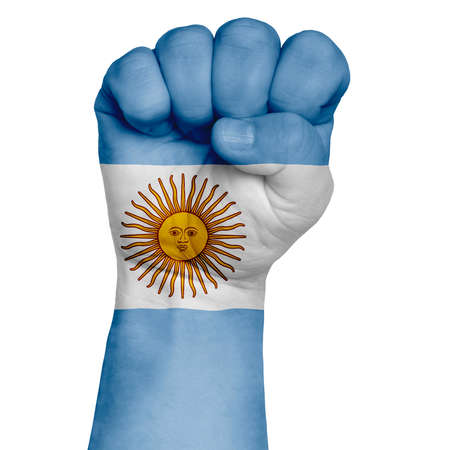 A restrained image of a fist painted in the colors of the flag of Argentina. Image on a white background. Isolate