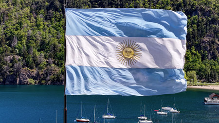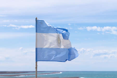 Argentina flag with atlantic ocean in background. Argentina landscape