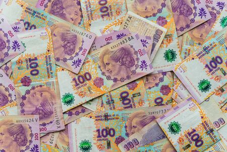 Argentine pesos money bills in big amount lies on teal color table close up. Finance and banking concept