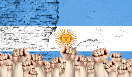 Raised fists of men against the background of the flag of Argentina painted on the wall, the concept of popular unity and the opinion of the majority.