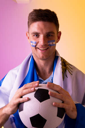 Portrait of happy caucasian male supporter with flag of argentina over pink lighting. Sport, movement, training and active lifestyle concept.