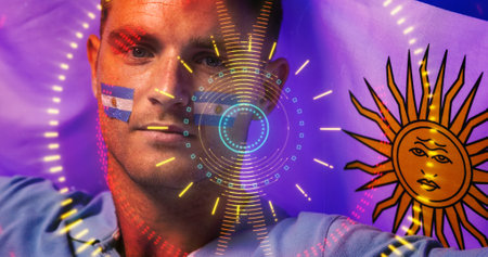Close-up caucasian soccer player with argentina flag and paints on face over illuminated circles. Portrait, serious, face, composite, sport, competition, patriotism, shape and abstract concept.