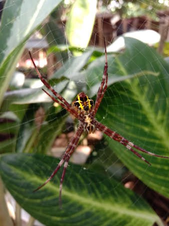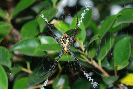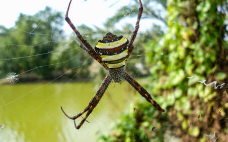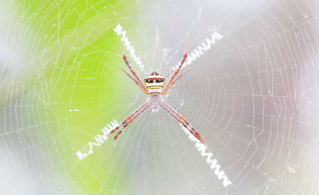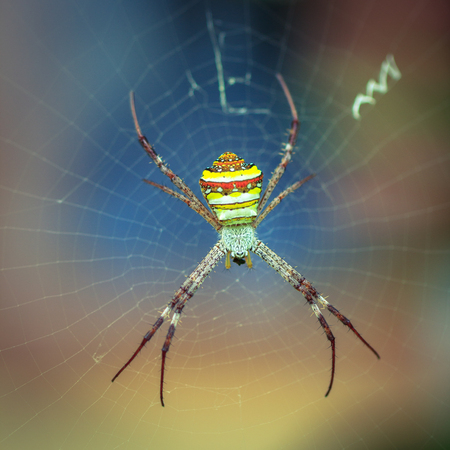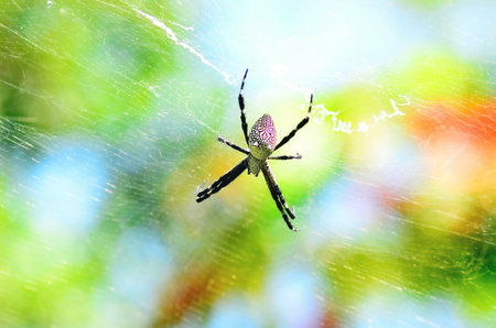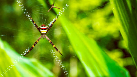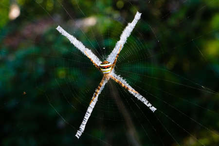 Exotic multicolored spider with a cobweb in the form of a cross. Thailand.