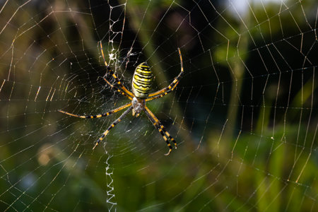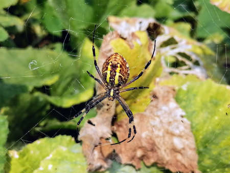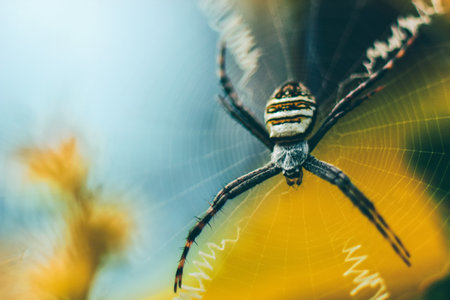 Closeup of exotic striped argiope bruennichi orb web spider sitting on cobweb against blurred background in daytime.