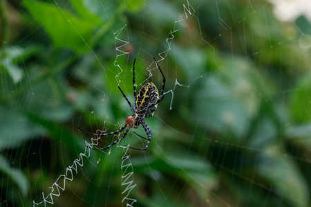 Argiope spider spinning its cobweb in countryside, closeup