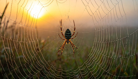 A patient orb-weaver spider waits at the center of its intricate web, silhouetted against the warm, golden light of a new day.