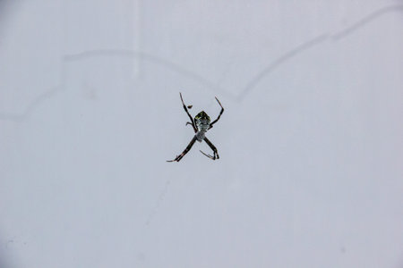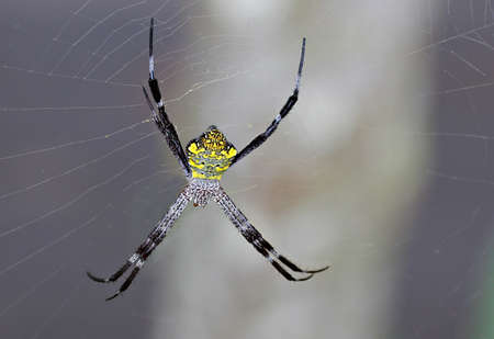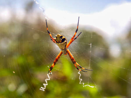 Great argiope spider hanging behind its cobweb