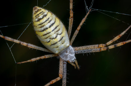 Macrophotography of a Wasp Spider (Argiope bruennichi) with web on dark background.