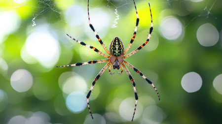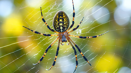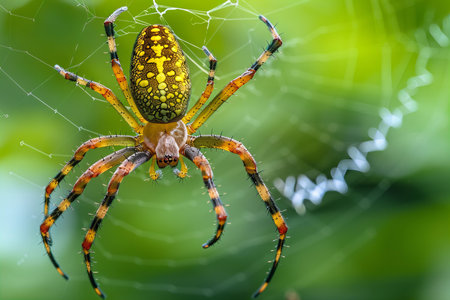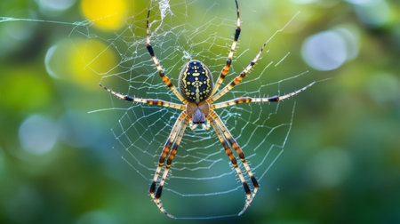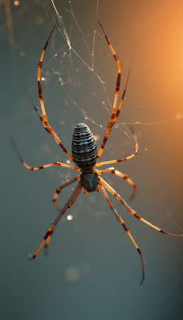 A stunning close-up of a spider gracefully suspended in its delicate web, illuminated by warm, golden light. The intricate patterns of the web and the spiders striking striped body create a captivating scene that evokes a sense of wonder and natures artistry.