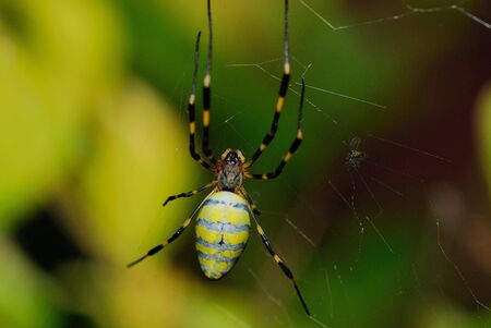 Image of yellow spider on web on nature background. Insect Animal.