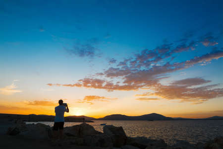 Beautiful sunset view from Lekuresi Castle (Saranda, Albania) to Ionian sea, small functioning lighthouse and island Corfu, Greece in the background