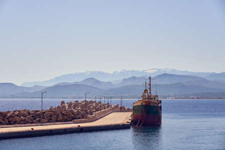 Kissamos, Crete, Greece - May, 26, 2019: A cargo ship Skylark in harbor against a rocky coast of Crete, Greece.