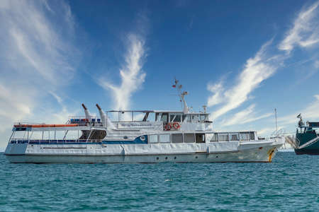 Sea pleasure large boat, name in Russian language, PETR CHAYKOVSKY. Crimea, Sudak - 10 October 2020.