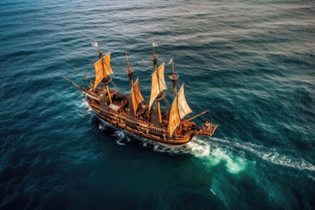 aerial view of pirate ship sailing at sea, created with generative ai