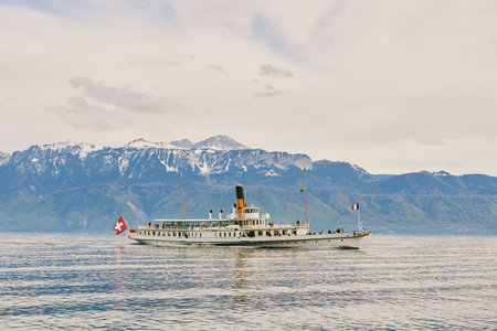 Steam boat with swiss and french flags floating on Lake Geneva or Lac Leman, Switzerland