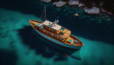fisherman boat and Vintage wooden boat in sea. Boat drone photo..Aerial view of tropical island beach holiday yacht on blue reef ocean
