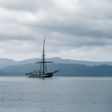 A tall sailing ship floats on a serene ocean. The image showcases the vessel with white sails set against a cloudy sky. The lighting highlights textures and creates a sense of depth, possibly suggesting adventure. This visual may be used for various commercial or editorial applications.