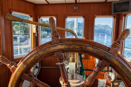 Steering-wheel in a boat cabin. Como Lake. Italy