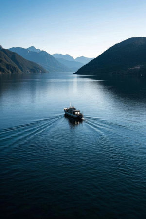 A tranquil scene of a ferry navigating through calm waters, with a backdrop of distant mountains and clear skies, highlighting maritime transportation