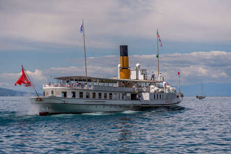 Morges, Vaud Canton, Switzerland - 21.06.2021: Suisse steamboat with passengers on Lake Geneva. CGN boat in summer.