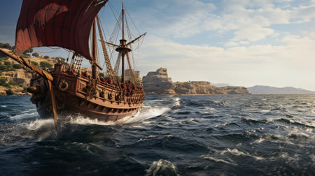 Ancient Greek ship sailing on vast sea crew in colorful togas