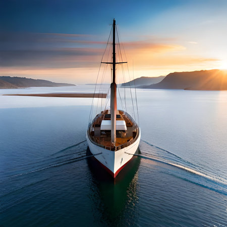 Luxurious yacht navigating sunlit ocean waves at sunset.