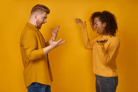 Angry couple arguing. Aggressive man and woman arguing isolated on orange background