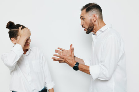 Close up image of couple having a quarrel against white background