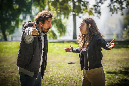 Couple arguing in an outdoor park during a tense emotional moment