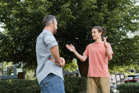 Young couple having an animated conversation outdoors