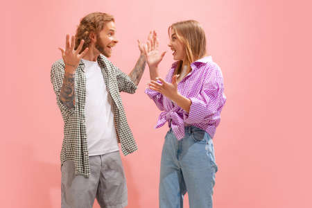 Portrait of young man and woman in casual clothes actively communicating, celebrating isolated over pink studio background. Concept of youth, lifestyle, relationship, emotions, facial expression, ad