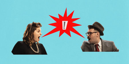Man and woman emotionally talking, arguing, leading debate with red exclamation mark between them on blue background. Contemporary art collage.