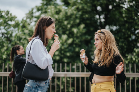 Friends talking and enjoying ice cream outdoors on a sunny day