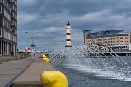 Malmö, Sweden - May 17, 2020: The old Malmö lighthouse with a fontain of water in the foreground
