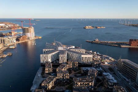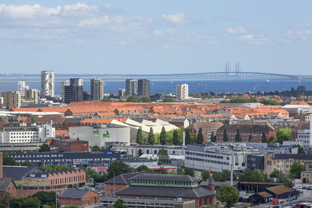 COPENHAGEN, DENMARK - JUNE 22, 2019 : Aerial view on the city, Oresund Bridge. It is railway and motorway bridge across the Oresund strait between Sweden and Denmark