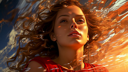 Long hair gently waving in the morning breeze, soft light highlighting her features and the texture of the sand. generative ai