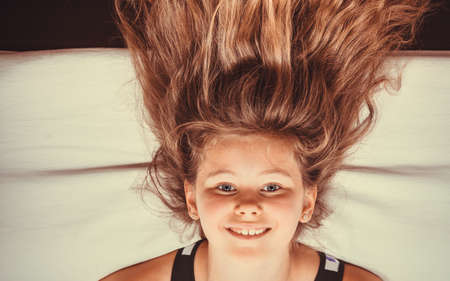 Happy little girl with long hair lying upside down on sofa at home. Kid playing having fun on couch.