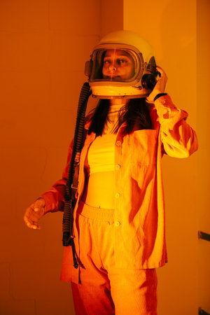 Female cosmonaut inside studio room with cosmic light