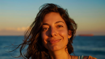 Portrait of a beautiful young woman with curly hair on the beach