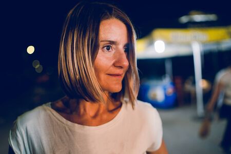 Portrait of woman in white T-shirt at fair in the night