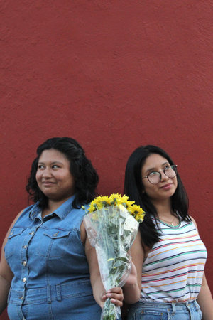 Young Latina sisters and friends, brunettes, give each other yellow flowers to show their love and the arrival of spring