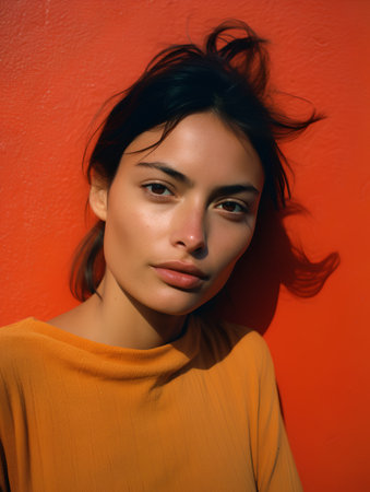 Portrait of a confident young woman with natural makeup and a soft smile in a stylish outfit