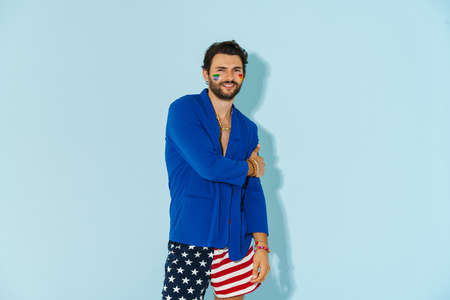 Happy hipster man holding American or USA flag. He is wearing casual clothes.