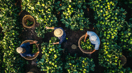 Aerial view of farmers working in a vegetable garden. Aerial view of farmers gathering ripe green produce on the field.
