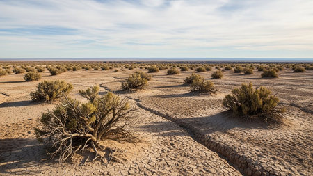 AI Generated. an image of a desert with cracked earth and sparse vegetation