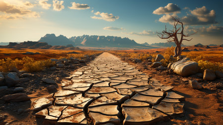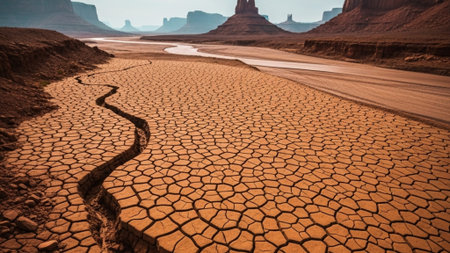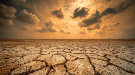 The image depicts the effects of the drought, including fractured soil and a lack of seasonal rain. due to a result of global warming. notion of global warming. The Generative AI