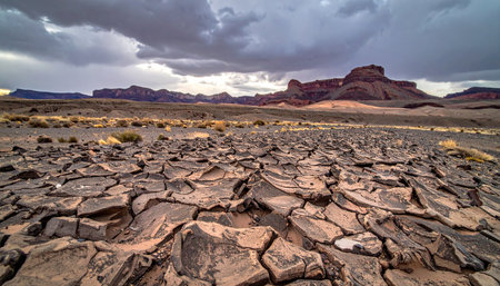 Under a dramatic sky heavy with storm clouds, the parched desert floor reveals a mosaic of deep cracks.