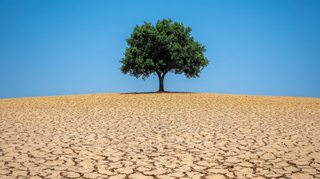 Lush green tree growing on a hill in the middle of a barren, cracked desert landscape under a vibrant blue sky, symbolizing resilience, hope, and the fight against climate change. Generative ai
