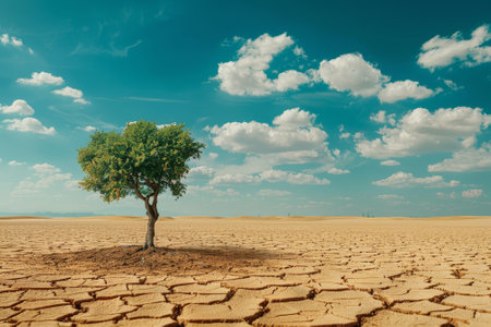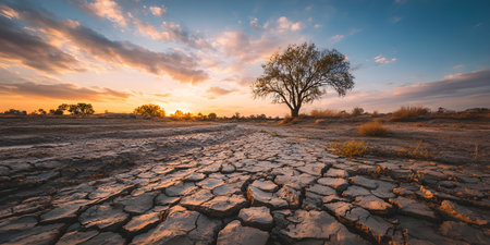 A captivating visual representation showcasing stark contrast between cracked drought-affected land and a resilient tree, symbolizing nature